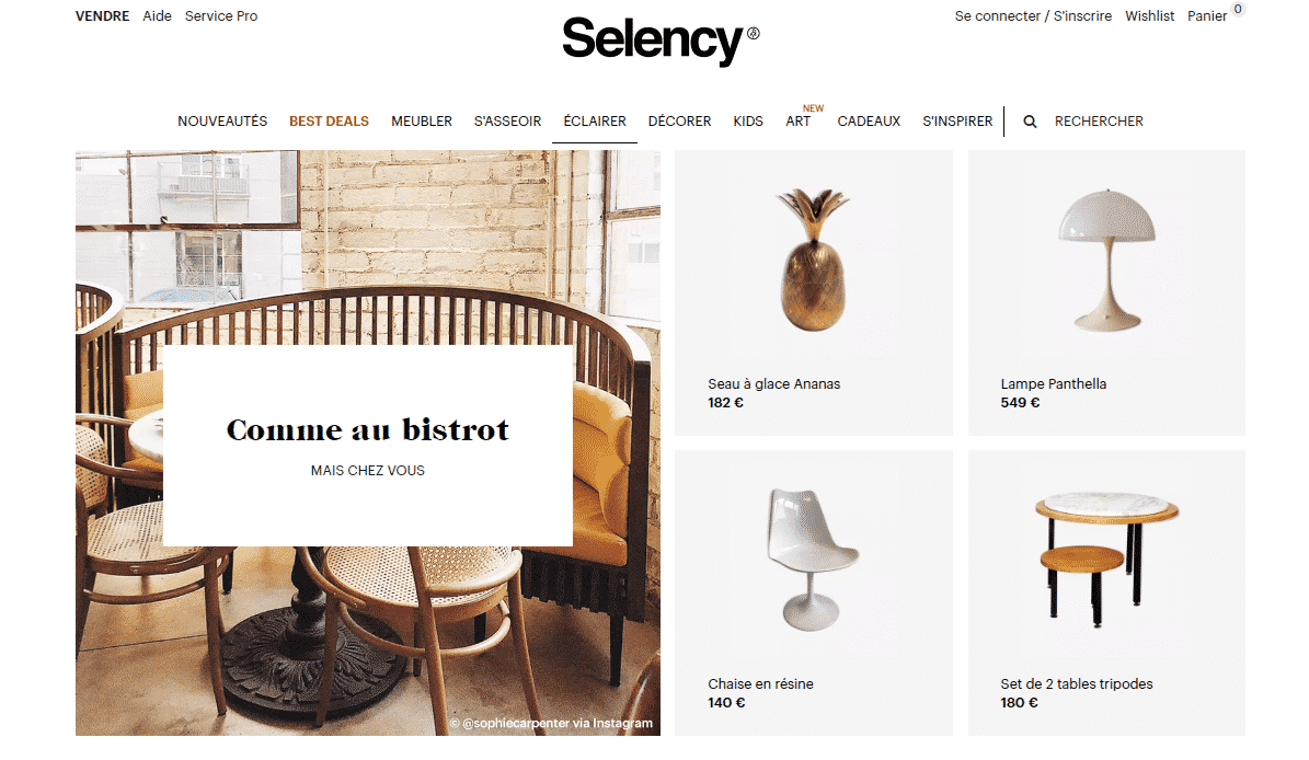 Selency, c’est la brocante en ligne par excellence ! Avec des milliers de produits en ligne, elle offre un choix varié de meubles, luminaires et décorations pour tous les goûts. Regroupant de nombreux professionnels, c’est l’endroit parfait pour trouver de petites pépites en matière de vintage. Le site décline des univers plus classiques et d’autres un peu plus particuliers, tels que ceux consacrés à la chambre pour enfants ou au jardin.